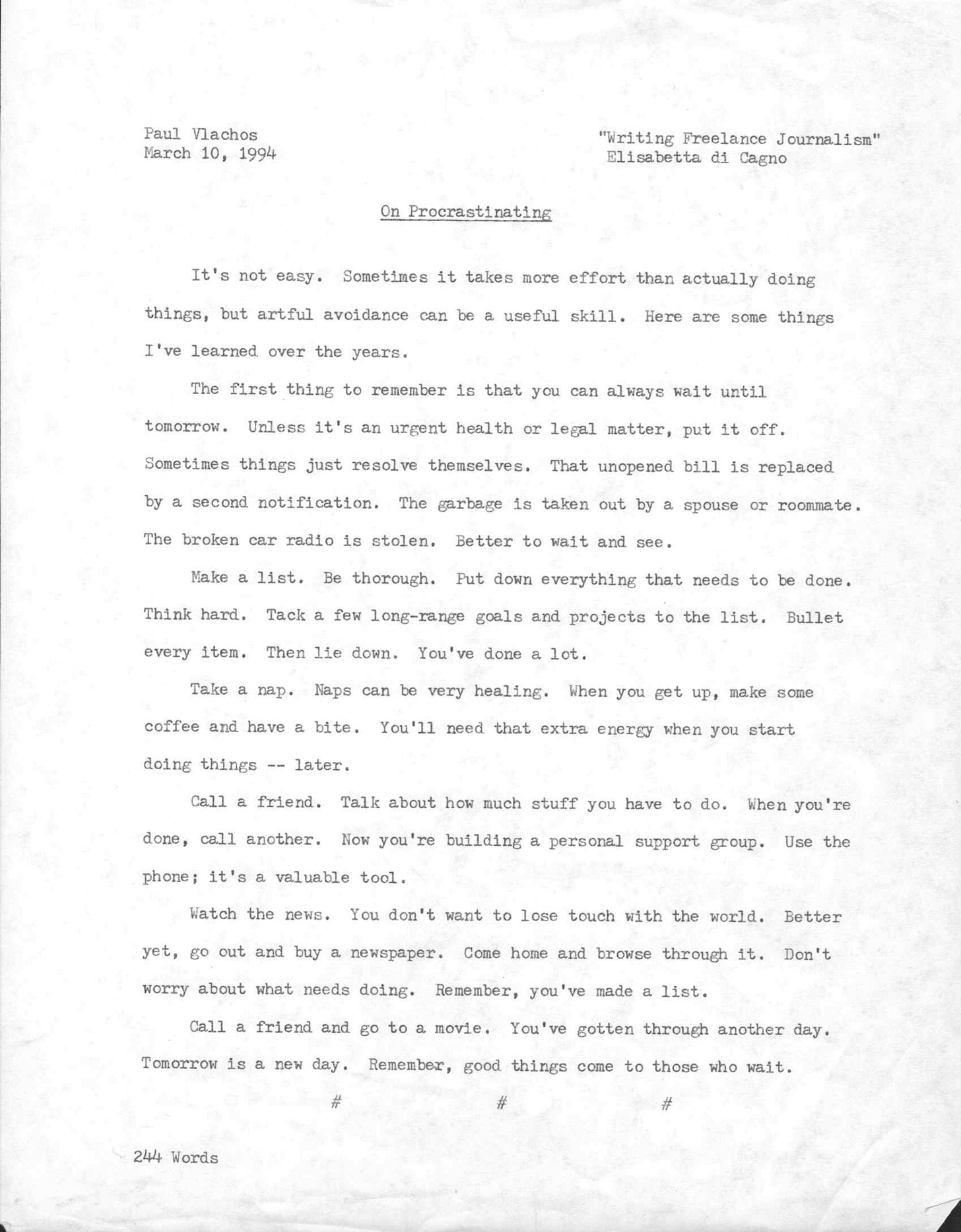 Watch the news. You don’t want to lose touch with the world. Better yet, go out and buy a newspaper. Come home and browse through it. Don’t worry about what needs doing. Remember, you’ve made a list.