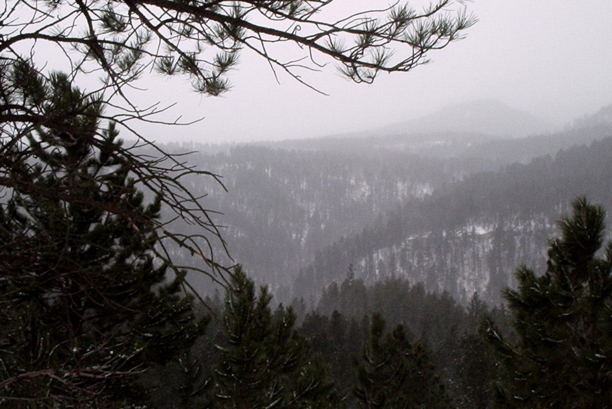 Snow falling thickly outside the living room windows all day. That gray, thin light. The smell of woodsmoke. I will never cease feeling grateful for the home in the Black Hills where I was raised. Even though I rebelled against all the quiet back then and longed for the bustle of a larger world. Now that I live at the heart of the bustle, (and yes, I would still choose it,) I am relieved to find I can still return my mind to that clearing the woods when it needs rest.